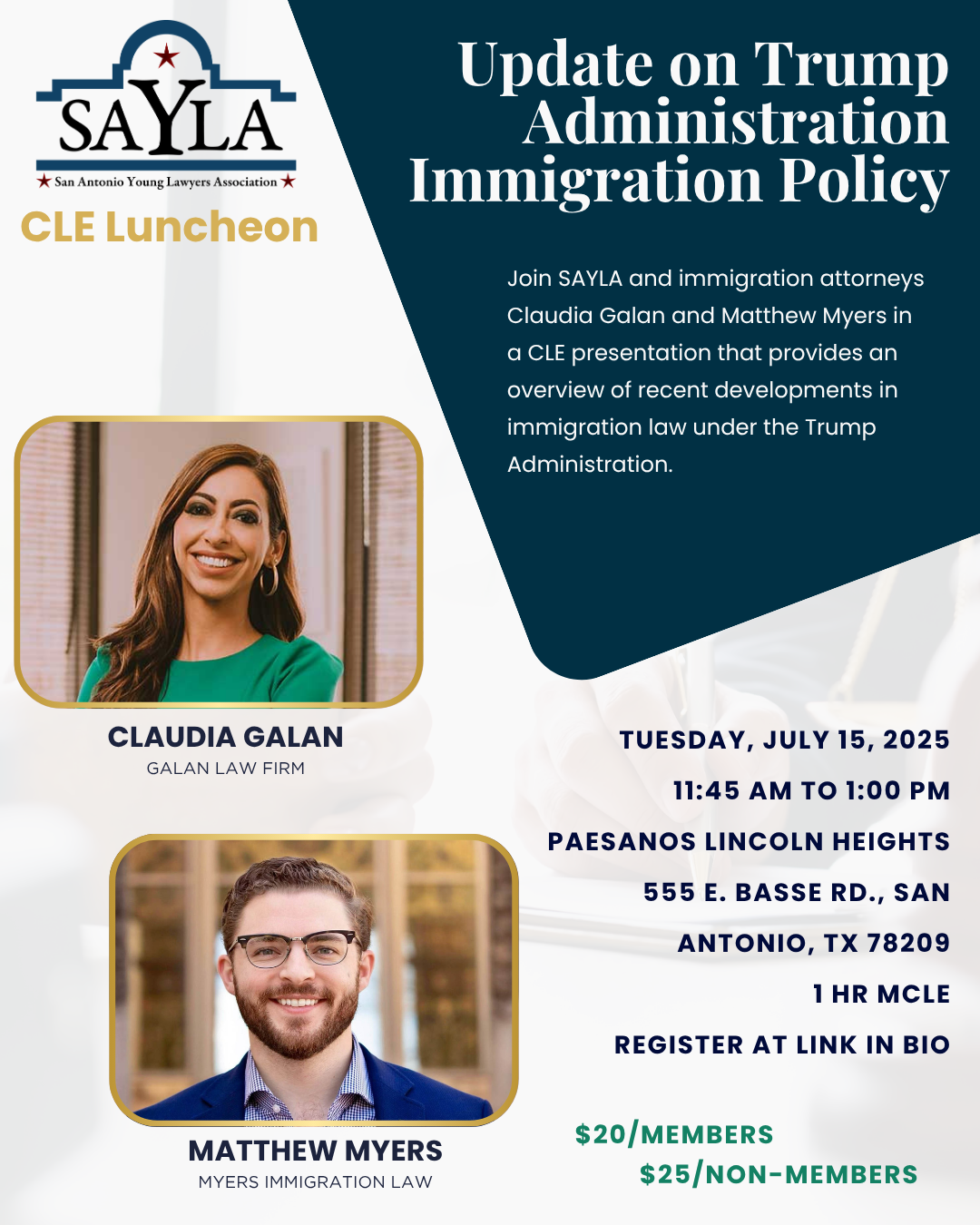 Join us for our monthly CLE Luncheon on 7/15 at Paesanos Lincoln Heights! This month‘s presentation, entitled “Update on Trump Administration Immigration Policy,” will be presented by Matthew Myers, Immigration Attorney and Board Certified by the Texas Board of Legal Specialization in Immigration & Nationality Law, and Claudia Galan, Immigration Attorney and founder of Galan Law Firm. |
