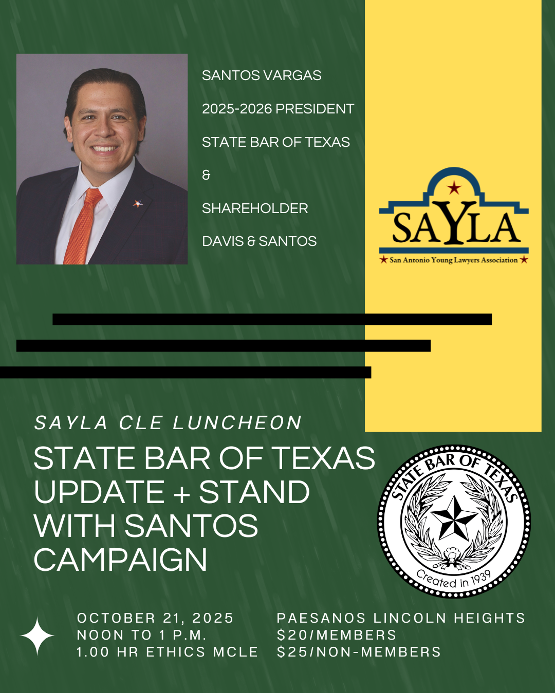 Please join us on Tuesday, 10/21 for 1.0 hours of ethics MCLE! Santos Vargas, our 2025-2026 State Bar of Texas President, will provide attendees with an SBOT update and will provide information on his Stand with Santos campaign. Date: Tuesday, October 21, 2025 Time: Please arrive by 11:45 a.m. The CLE begins at noon and runs through 1 p.m. Location: Paesanos Lincoln Heights, 555 E. Basse Rd., San Antonio, Texas 78209 MCLE: 1.0 hour MCLE (1.0 ethics) approved Parking: on-site. If full, park across the street (across Treeline Park) Attire: Office/business casual Lunch cost: $20/members; $25 non-members Link to register: https://sayla.memberclicks.net/oct2025clelunch |