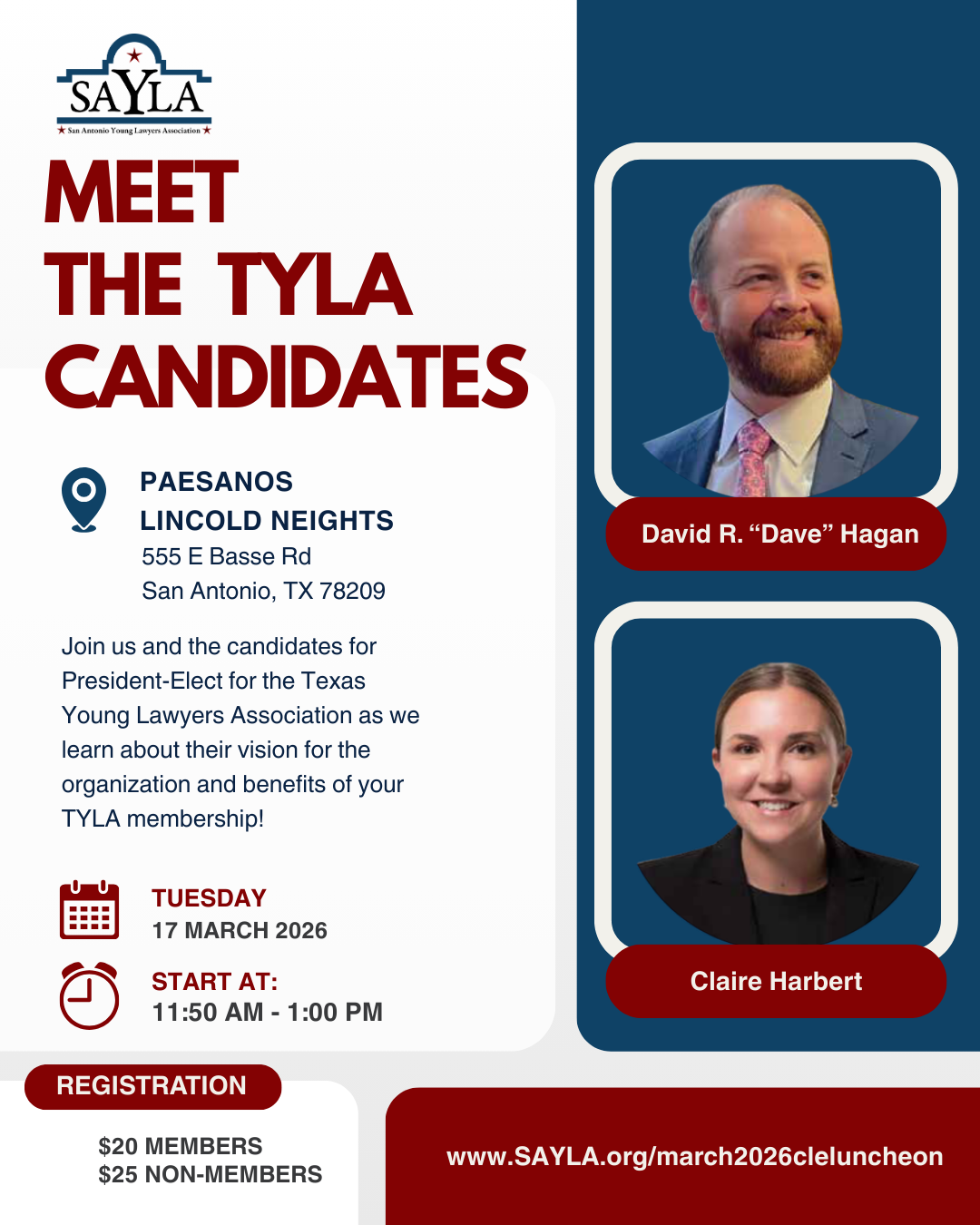 Date: Tuesday, March 17, 2026 Time: Please arrive by 11:45 a.m. The CLE begins at noon and runs through 1 p.m. Location: Paesanos Lincoln Heights, 555 E. Basse Rd., San Antonio, Texas 78209 MCLE: 1 hour CLE (0 ethics) pending Parking: on-site. If full, park across the street (across Treeline Park) Attire: Office/business casual Lunch cost: $20/members; $25 non-members Link to register: https://sayla.memberclicks.net/march2026cleluncheon |