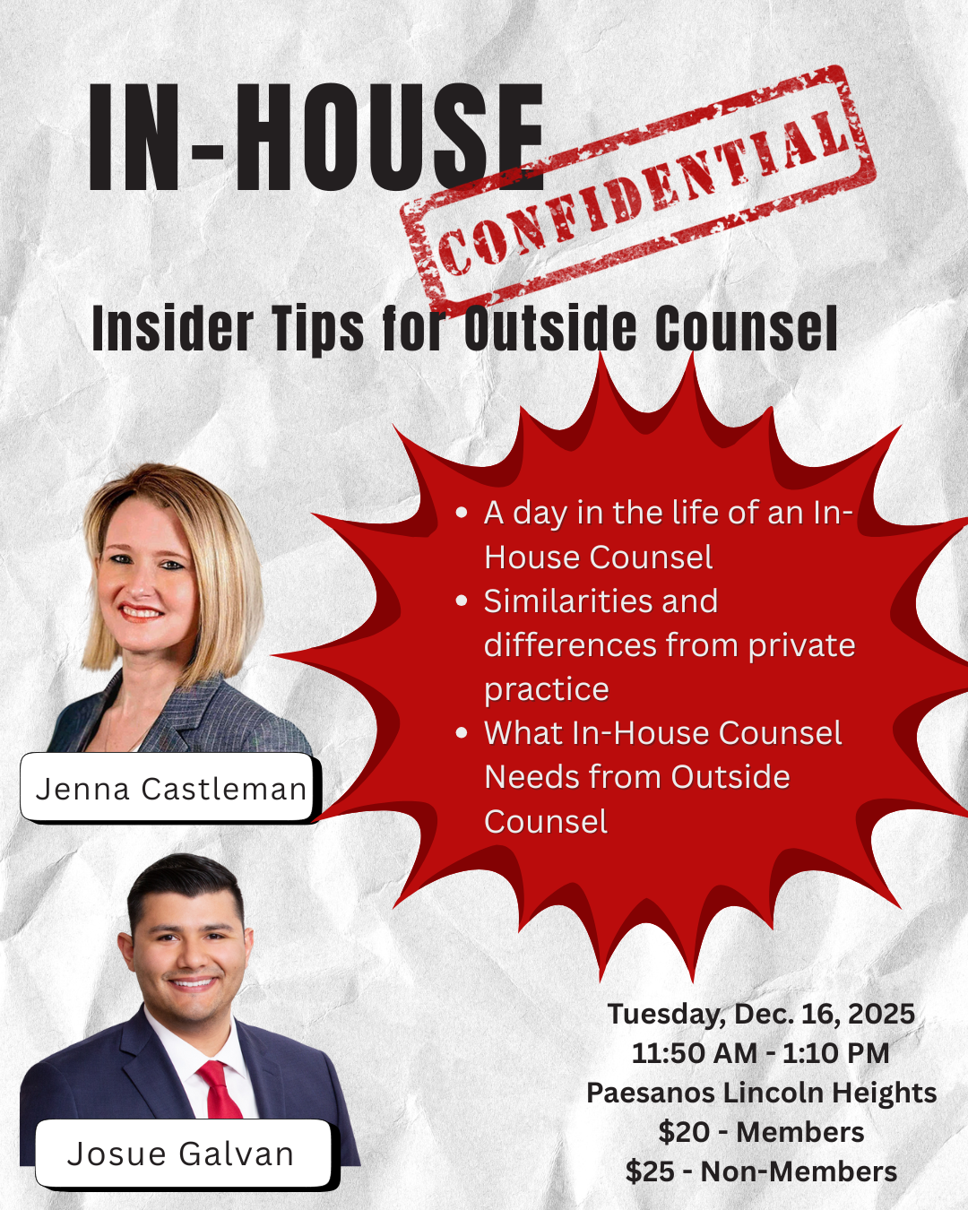 SAYLA Monthly CLE Luncheon - Tuesday, December 16, 2025 In-House Confidential: Insider Tips for Outside Counsel SAYLA's December 2025 CLE Luncheon features Jenna Castleman (Alterman) & Josue Galvan (USAA), and they will discuss a day in the life of an in-house lawyer, the similarities and differences are between in-house and private practice, and what they need from outside counsel. Date: Tuesday, December 16, 2025 Time: Please arrive by 11:45 a.m. The CLE begins at noon and runs through 1 p.m. Location: Paesanos Lincoln Heights, 555 E. Basse Rd., San Antonio, Texas 78209 MCLE: 1.00 hour CLE (0.00 ethics) pending Parking: on-site. If full, park across the street (across Treeline Park) Attire: Office/business casual Lunch cost: $20/members; $25 non-members Link to register: PLEASE CLICK HERE |